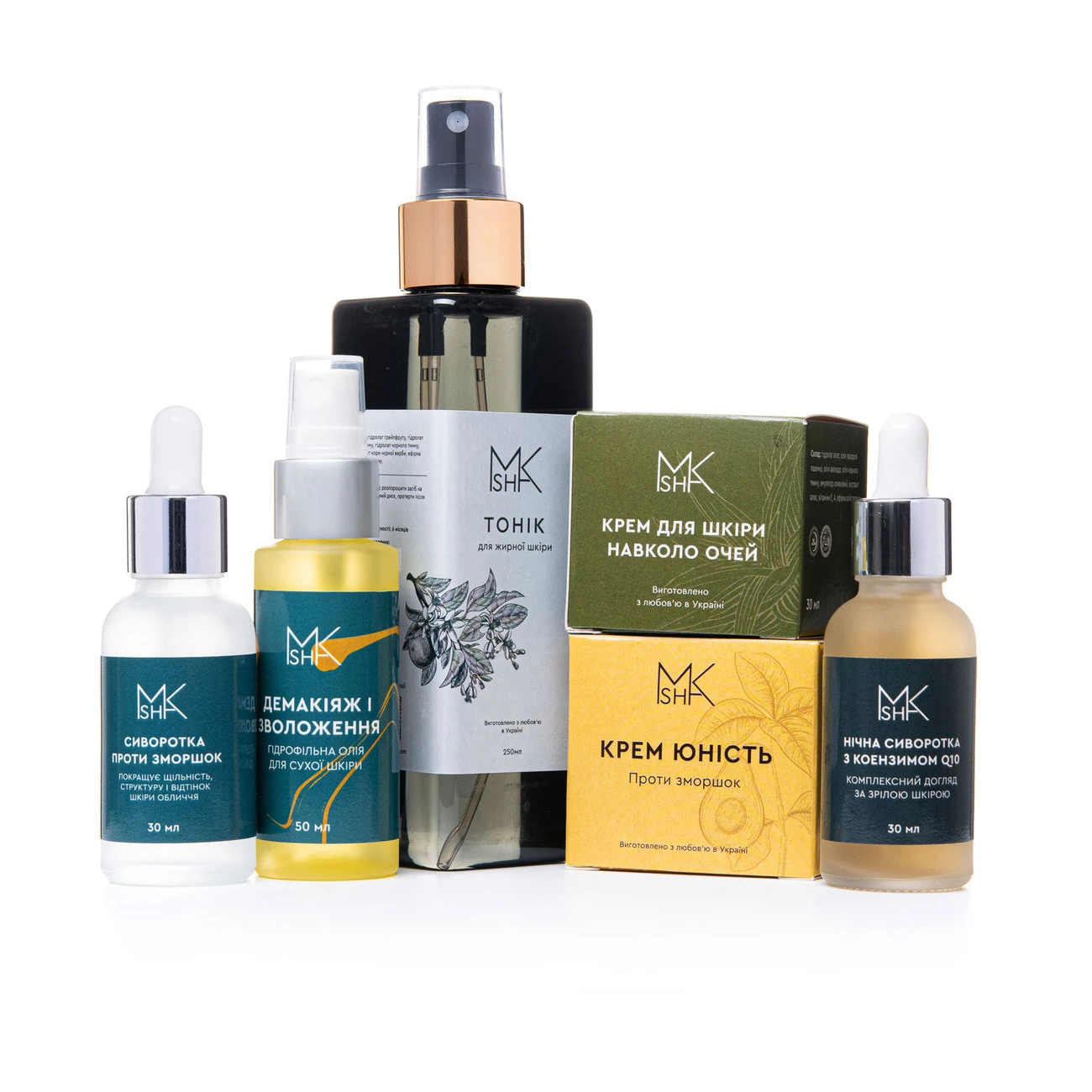 Склад набору: гідрофільна олія для сухої шкіри «Демакіяж і зволоження», тонік для жирної шкіри, сироватка проти зморшок, крем для шкіри навколо очей, крем для обличчя «Юність», нічна сироватка з коензимом Q10.