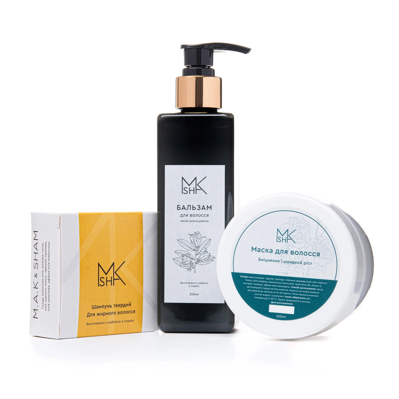 Склад набору: шампунь твердий для жирного волосся, бальзам для волосся «Легке розчісування», маска для волосся «Зміцнення і швидкий ріст».